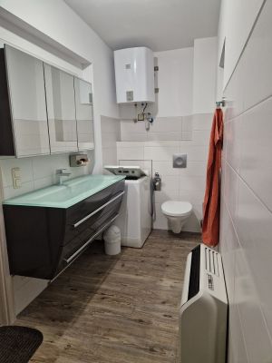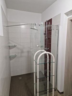 Das Bad ist modern und und mit einer bodengleichen, durch eine Glaswand abgetrennten Dusche ausgestattet. Die thermostatgeregelte Armatur sorgt für hohen Komfort und ist kindersicher. Die elektrische Fußbodenheizung sorgt in der Übergangszeit dafür, dass man barfuß gehen kann, während der Gas-Außenwandheizer den ganzen Raum wohlig warm macht. Der Waschtrockner erleichtert, gerade mit Kindern, das Sachenmanagement ungemein, da das Umfeld zum draußen spielen einlädt.