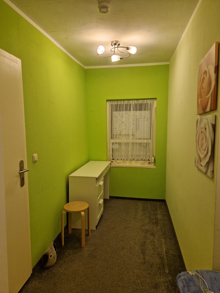 Vor dem Schreibtisch bietet der Raum ausreichend Platz für ein Kinderreisebett.